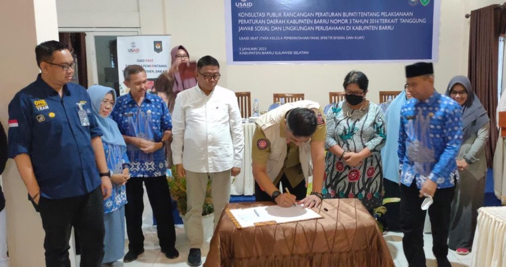 Mitra Utama USAID MADANI Daun Hijau di Kabupaten Barru mengadvokasi kepada pemerintah daerah untuk memberlakukan Peraturan Bupati (Perbup) yang dirancang untuk menerapkan peraturan daerah tahun 2016 tentang CSR. Dengan harapan disetujui pada bulan Maret 2023, peraturan baru tersebut antara lain akan membentuk tim koordinasi baru, yang akan mengikutsertakan OMS di Barru, dan untuk menentukan prioritas dan kelayakan CSR. Pada tanggal 5 Januari 2023, pemerintah daerah, bekerja sama dengan Daun Hijau, menyelenggarakan konsultasi publik untuk menerima umpan balik tentang Perbub yang tertunda ini. Kegiatan ini adalah salah satu dari beberapa acara yang telah diselenggarakan Daun Hijau sebagai bagian dari kampanye mereka untuk meningkatkan lingkungan pendukung bagi OMS di Barru. Setelah Perbub diberlakukan, peraturan ini akan menyediakan mekanisme bagi OMS untuk memanfaatkan peluang pendanaan dari lebih dari 30 korporasi yang aktif di Barru.